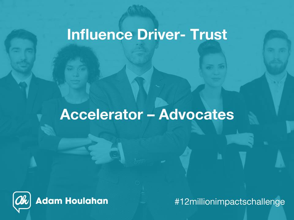 The final accelerator in creating trust is creating advocates. These are the people who love what you do so much they are prepared to give you reviews, recommendations, referrals and shout your name across social channels as the go to person in your field of expertise.